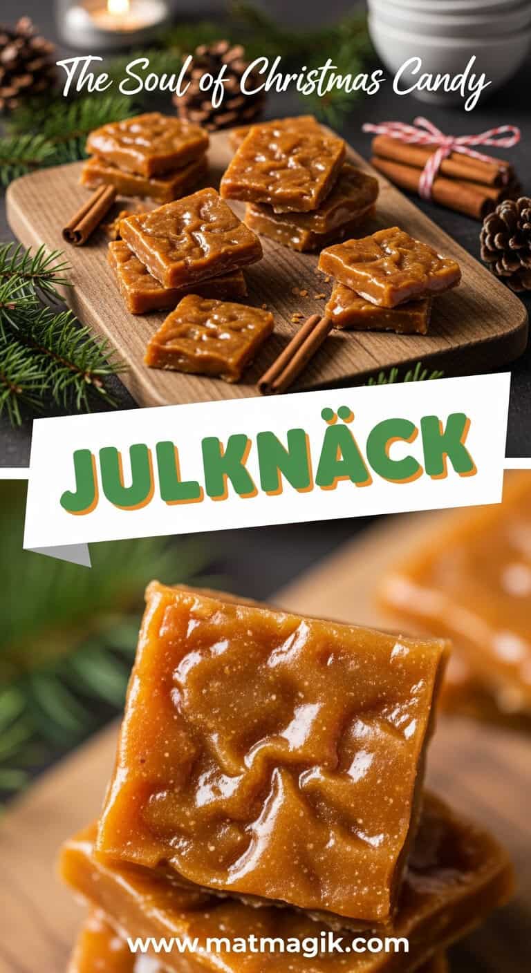 Julknäck is a traditional Swedish Christmas toffee or butterscotch, typically made with cream, sugar, and syrup. It's known for its chewy texture and sweet, rich flavor, often served in small paper cups during the holiday season.
